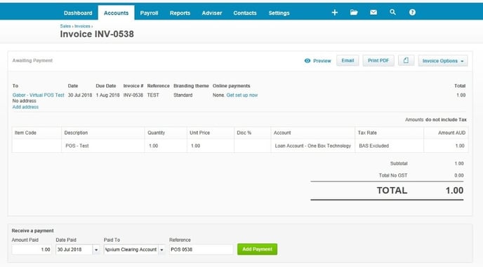 Find the invoice in the Accounts tab as per below and allocate the funds in the “Receive a Payment” section by choosing the “Paid To” field as the Apxium Clearing Account. Fill in all the other fields and click on Add Payment.